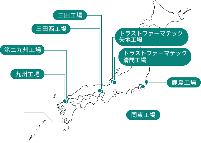 全国6工場(鹿島、関東、三田、三田西、九州、第二九州)の多拠点生産体制を確立しており、年間生産能力は現在205億錠。さらに今年度に発表した、グループ会社であるトラストファーマテックへの195億円の投資など継続した投資を進めており、2030年度には250億錠を達成する計画となっています。