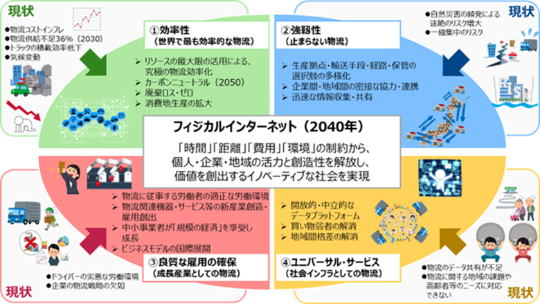 フィジカルインターネットとは、インターネット通信の考え方を物流に適用し、デジタル技術を活用して物資や倉庫、車両の空き情報を見える化し、規格化された容器に詰められた貨物を複数企業の物流資産をシェアしたネットワークで輸送する仕組みです。 この新しい物流システムは、効率性、強靭性、良質な雇用の確保、ユニバーサルサービスの提供を目指しており、2040年までの実現を目標としています。