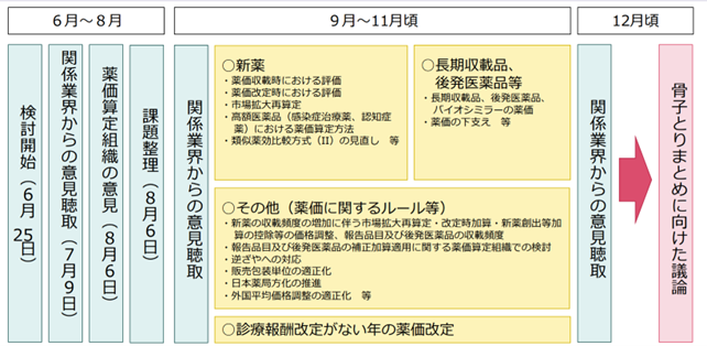 令和8年度薬価制度改革については、(1)令和7年度薬価改定及び令和6年度薬価制度改革の骨子に記載されている事項等、(2)これまでに問題提起された事項等、(3)その他薬価算定組織や関係業界から提起された事項等を踏まえて、令和7年6月から厚生労働省の中央社会保険医療協議会(中医協)の薬価専門部会・総会で議論が開始され、3回の業界意見陳述を経て、令和7年12月26日に「薬価制度改革の骨子」、令和8年1月16日に「令和8年度薬価改定に係る薬価算定基準の見直しについて」がそれぞれ了承され、令和8年2月13日に「薬価算定の基準について」が通知されました(議論の経緯は、図1参照)。その後、令和8年3月5日に薬価改正の告示がなされたところです。