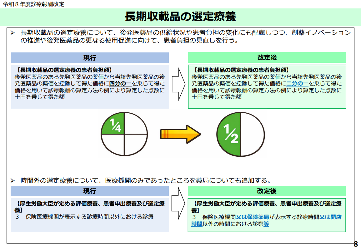 令和8年度の診療報酬改定では、長期収載品の選定療養について、後発医薬品の供給状況や患者の負担の変化にも配慮しつつ、創薬イノベーションの推進や後発医薬品の更なる使用促進に向けて、患者負担の見直しが行われました。