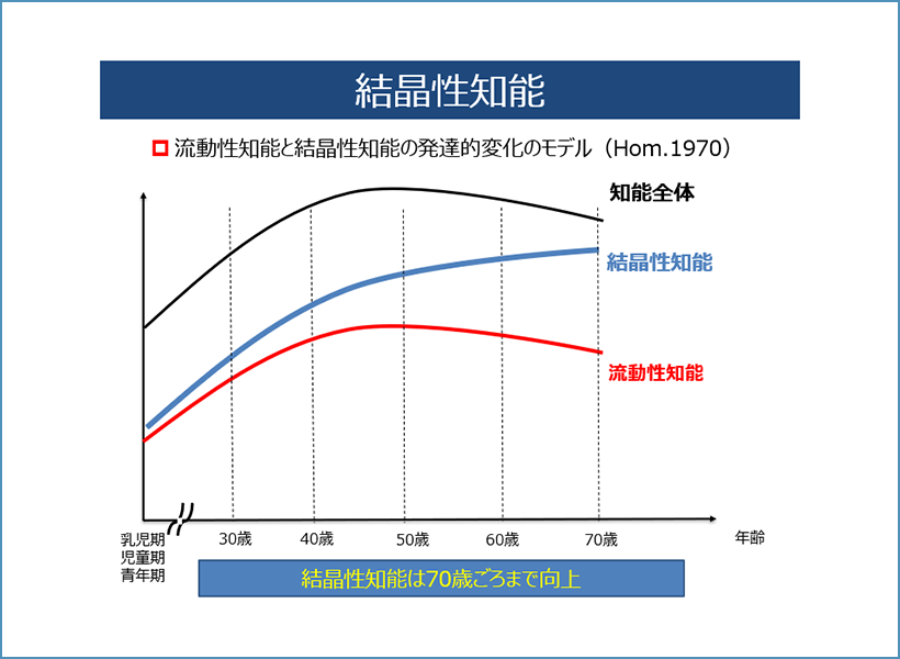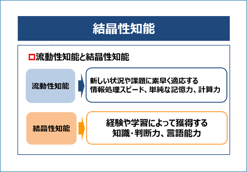 結晶性知能は経験や学習によって獲得する知識・スキル、判断力、言語能力です。