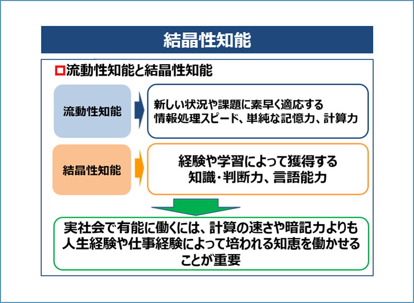 実社会で有能に働くには、計算の速さや暗記力よりも、人生経験や仕事経験によって培われる知恵である結晶性知能を働かせることが重要です。