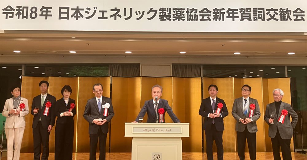 2026年01月21日 レポート フォトレポート「令和8年GE薬協新年講演会及び賀詞交歓会を開催(1月20日)」 講演会の様子(演者:北里大学大学院薬学研究科 教授/医薬品医療機器総合機構 審査センター長 成川衛氏) 賀詞交歓会の様子(左から:ジェネリック医薬品の将来を考える会 事務局次長/参議院議員 本田顕子氏、参議院議員 神谷政幸氏、衆議院議員 堀内詔子氏、日本ジェネリック製薬協会 会長 川俣知己氏、日本製薬団体連合会 会長 安川健司氏、参議院議員 福岡資麿氏、参議院議員 江島潔氏、ジェネリック医薬品の将来を考える会 特別顧問 藤井基之氏) (バックナンバーはこちらから)日本ジェネリック製薬協会|フォトレポート「令和7年GE薬協新年講演会及び賀詞交歓会を開催(1月21日)」